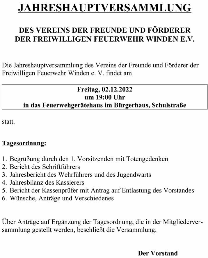 Die Jahreshauptversammlung des Vereins der Freunde und Förderer der Freiwilligen Feuerwehr Winden e. V. findet am Freitag, 13.12.2024, um 19:00 Uhr im Feuerwehrgerätehaus im Bürgerhaus, Schulstraße, statt.