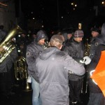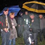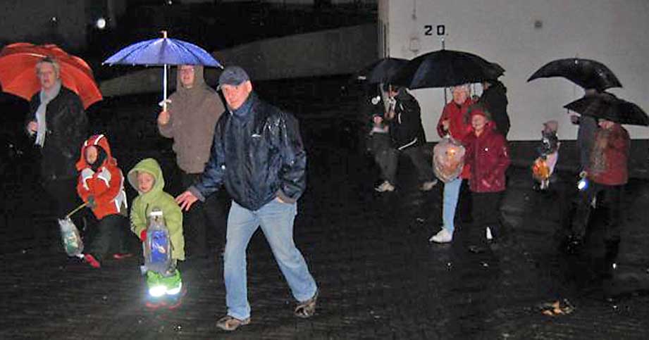 „Laterne, Laterne“ und andere Lieder sangen etwa 150 Kinder und Erwachsene beim Martinszug, der am Samstagabend trotz heftigen Regens und leichten Sturms von der Windener Pfarrkirche zum Sportplatz führte. Begleitet wurden die Martinszügler von den Klängen der Musikkapelle Daubach. Am Sportplatz hatten die Waldarbeiter Peter Kurth und Benjamin Mono bereits genügend Holz für ein Martinsfeuer aufgeschichtet, das auch bei dem ungemütlichen Wetter ordentlich brannte.