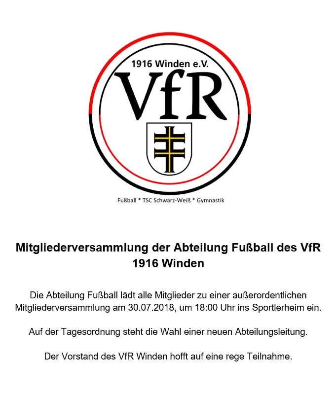 Die Abteilung Fußball des VfR Winden lädt alle Mitglieder, Fans und Freunde am Freitag, den 02.11.18 ab 19 Uhr zum VfR Abend am Sportplatz ein.