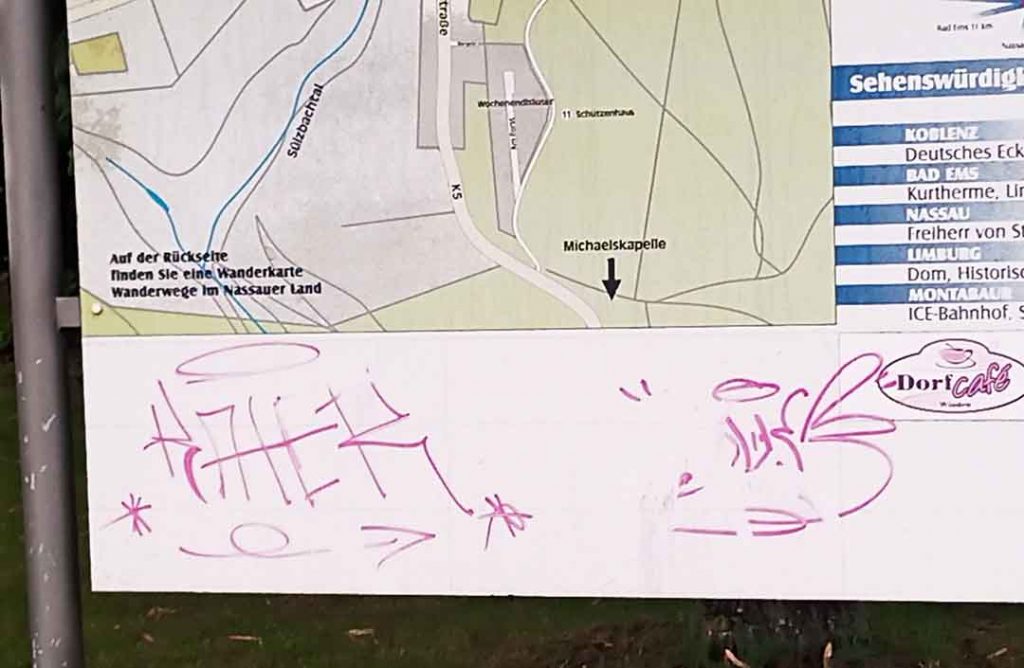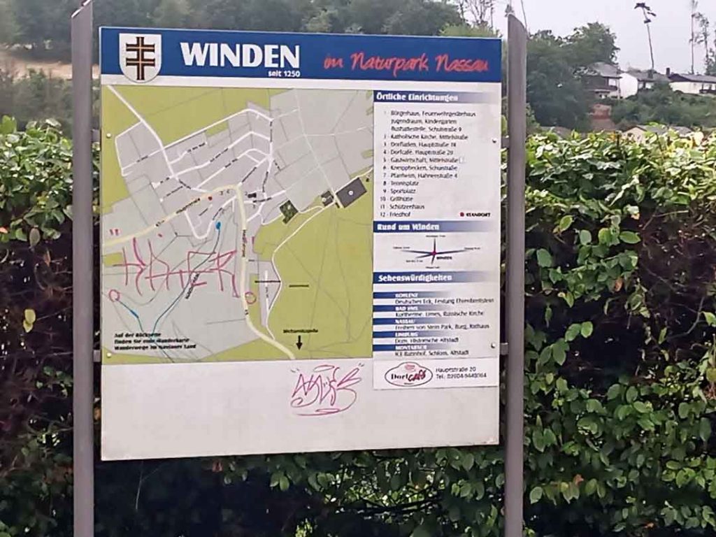 Eine Reihe von Sachbeschädigungen sind Ortsbürgermeister Stefan Mertlich in jüngster Zeit gemeldet worden. „Ob es Dummejungenstreiche waren oder nicht, weiß ich nicht. Aber in unserer schönen Ortsgemeinde Winden wurden öffentliche Einrichtungen beschmiert“, ist Mertlich empört. Die beiden Übersichtstafeln über die Ortsgemeinde Winden am Spielplatz und an der Hauptstraße seien ebenso beschädigt worden wie eine Ruhebank im Götzenthaler Weg, die Mertlichs Amtsvorgänger und jetzigem 1. Beigeordneten Gebhard Linscheid gewidmet ist.