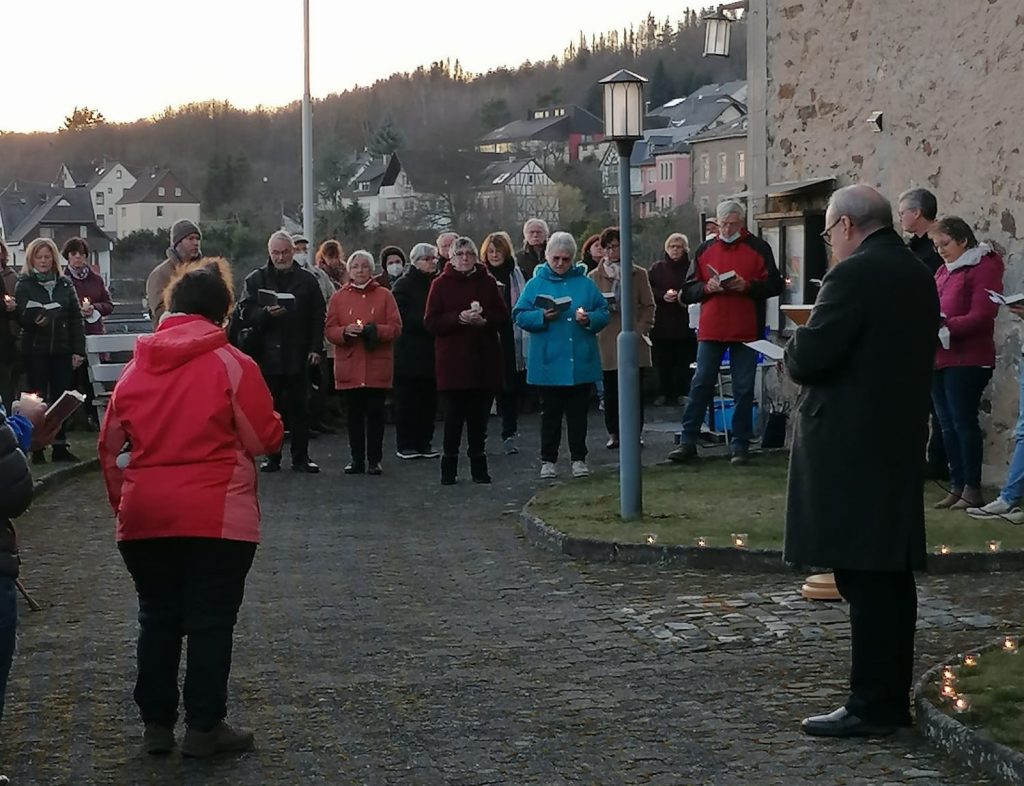Die Lieder, Texte und Fürbitten des von Pfarrer Scheungraber, Felix Falterbaum, Beate Eschenauer, Sandra Eifler und Gebhard Linscheid gestalteten Friedengebetes machten deutlich, dass Frieden und friedliches zusammenleben der Menschen mit- und untereinander alternativlos ist. Um so mehr sollte sich dafür ständig eingesetzt und gebetet werden. Möge das Licht der brennenden Kerzen in den Händen der Teilnehmer ein Signal für den Frieden in die Welt senden.
