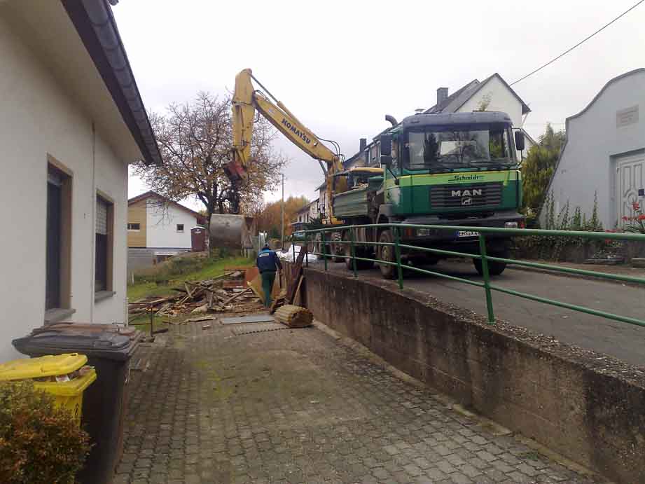 Mit den Tiefbauarbeiten in der Ortsstraße „Am alten Wasserhaus“ ist am Mittwoch begonnen worden. Die mit den Arbeiten beauftragte Firma Schmitt ist eingetroffen und hat mit dem Abriss der Holzhütte begonnen, danach wird die Stützmauer entfernt. Im Anschluss, so Ortsbürgermeister Gebhard Linscheid, werden die Erdarbeiten für die Verlegung von Strom, Wasser und Gas erfolgen. Die Anwohner müssen während dieser Zeit mit Behinderungen rechnen, so Linscheid. Es sei möglich, dass sie nicht immer ihr Auto abends in die Garage fahren können. Sie würden jedoch rechtzeitig von der Firma Schmitt darüber informiert, so der Ortschef.