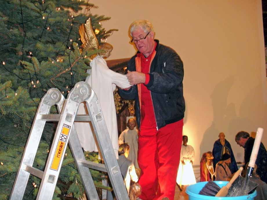 Wenn die Gläubigen sich an Weihnachten über eine schöne Krippe und einen festlich geschmückten Tannenbaum in der Pfarrkirche St. Willibrord Winden erfreuen, sehen die wenigsten von ihnen, wieviel Arbeit dahinter steckt, um alles festlich herzurichten. Schon Tage vorher waren emsige Hefer damit beschäftigt, den schönen großen Baum in die Kirche zu bringen und auch die einzelnen Teile der vor einem Jahr neu gestalteten Krippe zu einem großen Ganzen zusammenzufügen. Dank für ihre Mühen gebührt deshalb einigen fleißigen Männern, die dafür gesorgt haben, dass die Windener das Weihnachtfest in ihrer Kirche in einem würdigen Rahmen feiern können. Die Krippenbauer waren Jürgen Müller, Helmut Klöckner und Heinz-Jürgen Schlösser, das Einbringen Weihnachtsbaum erledigten Werner Rommersbach, Sascha Handwerker, Olaf Schwaderlapp, Markus Falterbaum und Helmut Klöckner.