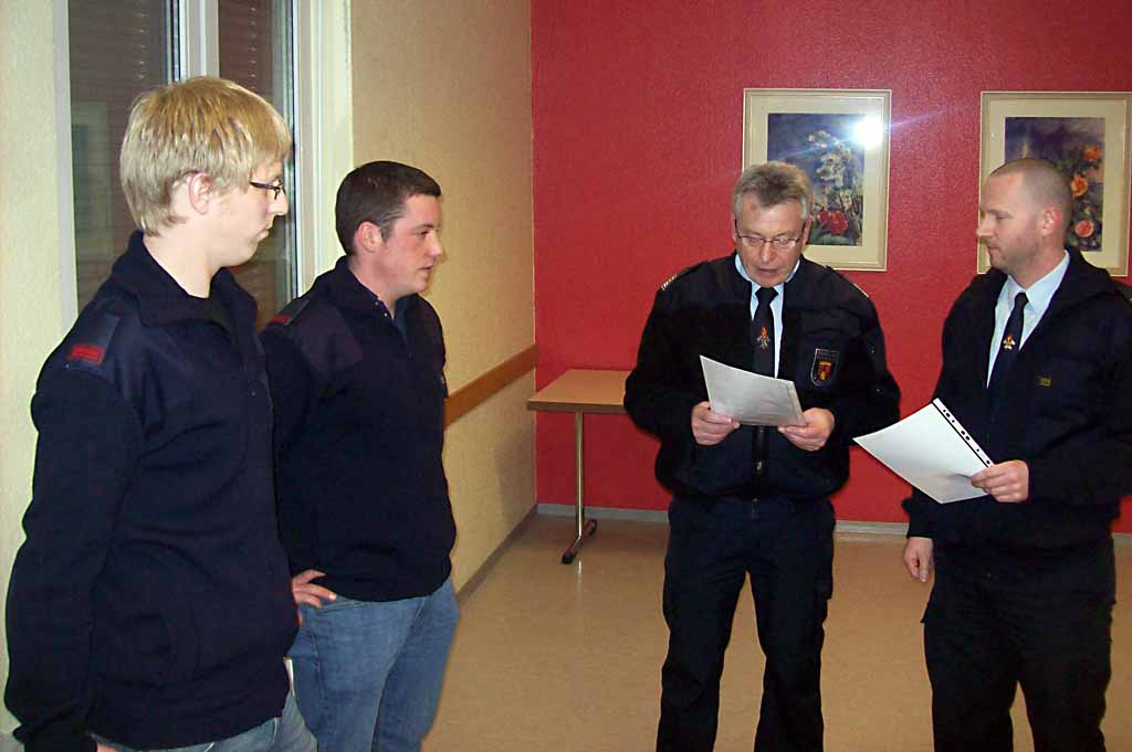Die Feuerwehrmänner Florian Linscheid und Mathias Dus wurden zu Oberfeuerwehrmännern befördert, da sie sich durch besondere Leistungen ausgezeichnet hatten.