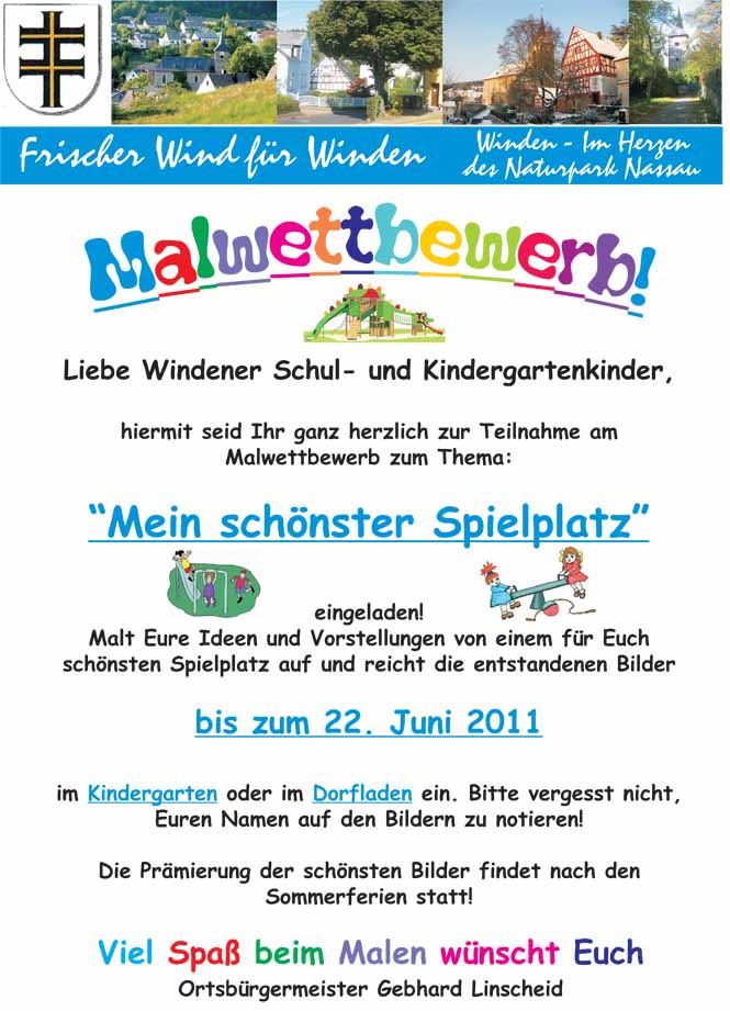 „Mein schönster Spielplatz“, so lautet das Motto eines Malwettbewerbs, zu dem die Ortsgemeinde Winden alle Schul- und Kindergartenkinder der Gemeinde aufruft. Die Kinder sind eingeladen, Bilder zu malen, wie sie sich ihren schönsten Spielplatz vorstellen. Die fertigen Werke sind bis 22. Juni im Kindergarten oder im Dorfladen einzureichen. Nach den Sommerferien werden die schönstgen Bilder prämiert. Ziel der Gemeinde ist es, die Windener Kinder an der Gestaltung des Dorfes zu beteiligen und Ideen für ein kinderfreundliches Dorf zu entwickeln.