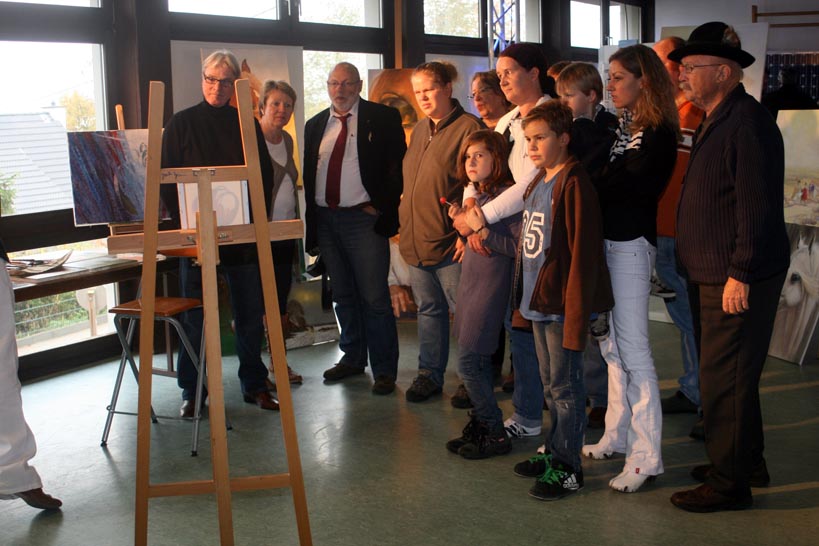 Wie man Bürsten und Besen herstellt, zeigte die sehbehinderte Susanne Linscheid. Am Stand der Diakonie Friedenswarte Bad Ems/Nassau konnten sich die Besucher über die Arbeit in der Altenpflege informieren, und bei Andrea Kurth Blutdruck und Blutzucker messen lassen. Neu in diesem Jahr war, dass sich neben den Gewerbetreibenden in der Ausstellung auch einige heimische Künstler präsentierten. Der Hobbykünstler-Stammtisch Winden war mit drei Künstlerinnen vertreten: Antonie von Koblinski stellte Keramiken und einen kleinen Teil ihrer Malereien aus. Erika Fritsche war mit ihren tollen Aquarellen vertreten, und Karin Hentschel zeigte ihre schönen Öl- und Acrylbilder. Sogar ein waschechter Profi-Künstler war gekommen: Josch Braun, ein seit kurzem in Winden ansässiger und weithin bekannter Maler, Bildhauer Fotograf und Kunstdozent, zeigte einige seiner Werke. Staunende Blicke erhielt er, als er den Besuchern zeigte, wie er in Windeseile ein Ölbild malt. Gerade einmal zehn Minuten brauchte er dafür. Dabei erklärte Josch Braun zwischendurch, wie man am besten vorgeht und welche Farbkombinationen die geeignetsten sind.