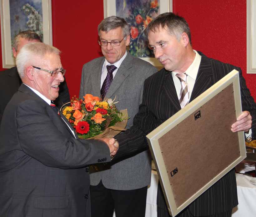 Applaus für Helmut Klöckner (vorne links). Die Ehrenurkunde überreichte ihm Ortsbürgermeister Gebhard Linscheid (Mitte). Rechts: Ratsmitglied Gerald Eschenauer. Foto: Jachtenfuchs