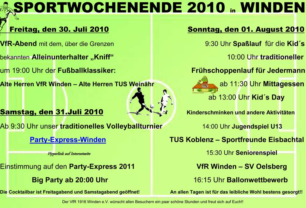 Sport, Spiel, Musik und jede Menge Spaß — das verspricht das dreitägige Sportwochenende vom kommenden Freitag, 30. Juli, bis Sonntag, 1. August. Geboten werden Fußball, Volleyball und ein Jedermannslauf. Höhepunkte sind der VfR-Abend am Freitag- und die „Big Party“ am Samstagabend. Aber auch die jüngsten Besucher sollen auf ihre Kosten kommen. Das gesamte Programm hier im Überblick (zum Vergrößern bitte anklicken!)