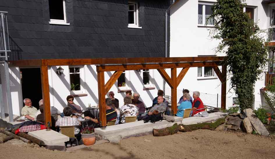 Das Windener Dorfcafé ist um eine Attraktion reicher: Seit kurzem ist die Außenterrasse fertiggestellt, so dass die Gäste nun Kaffee und Kuchen auch gemütlich im Freien genießen können — wenn es das Wetter zulässt. Die neue Terrasse ist einmal mehr ein Beispiel für den in Winden vorhandenen Gemeinschaftssinn. Nachdem fleißige Helfer vor zwei Wochen bereits die Pflasterarbeiten erledigt hatten, montierten sie am Samstag die Holzbalken. Außerdem wurde der Garten gemulcht, Anfang dieser Woche wird Rasen eingesät Mit einer Werbeoffensive wollen die Verantwortlichen demnächst auch mehr Gäste anlocken: Ein „Flyer“ soll gedruckt und in den Nachbardörfern verteilt werden. Denn immerhin ist Winden für Wanderfreunde ein schönes Ausflugsziel, in dem sich eine Rast lohnt.
