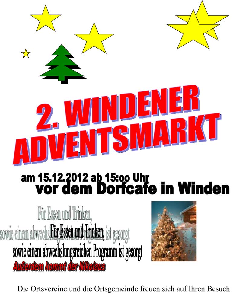 Die Ortsvereine und die Dorfgemeinschaft laden für Samstag, 15. Dezember, ab 15 Uhr zu einem kleinen, aber feinen Adventsmarkt rund ums Dorfcafé ein. In liebevoll geschmückten Buden und im Dorfcafé werden verschiedene Leckereien angeboten. Unter anderem bietet der Windener Künstlerkreis seine Malereien und Töpferarbeiten zum Verkauf an. Und vieles, vieles mehr. Zu den jüngsten Besuchern kommt der Weihnachtsmann. Nach dem Erfolg der Premiere des Adventsmarktes vor zwei Jahren hofft der Bürgerverein bei der Neuauflage nunmehr auf regen Besuch der Bevölkerung.