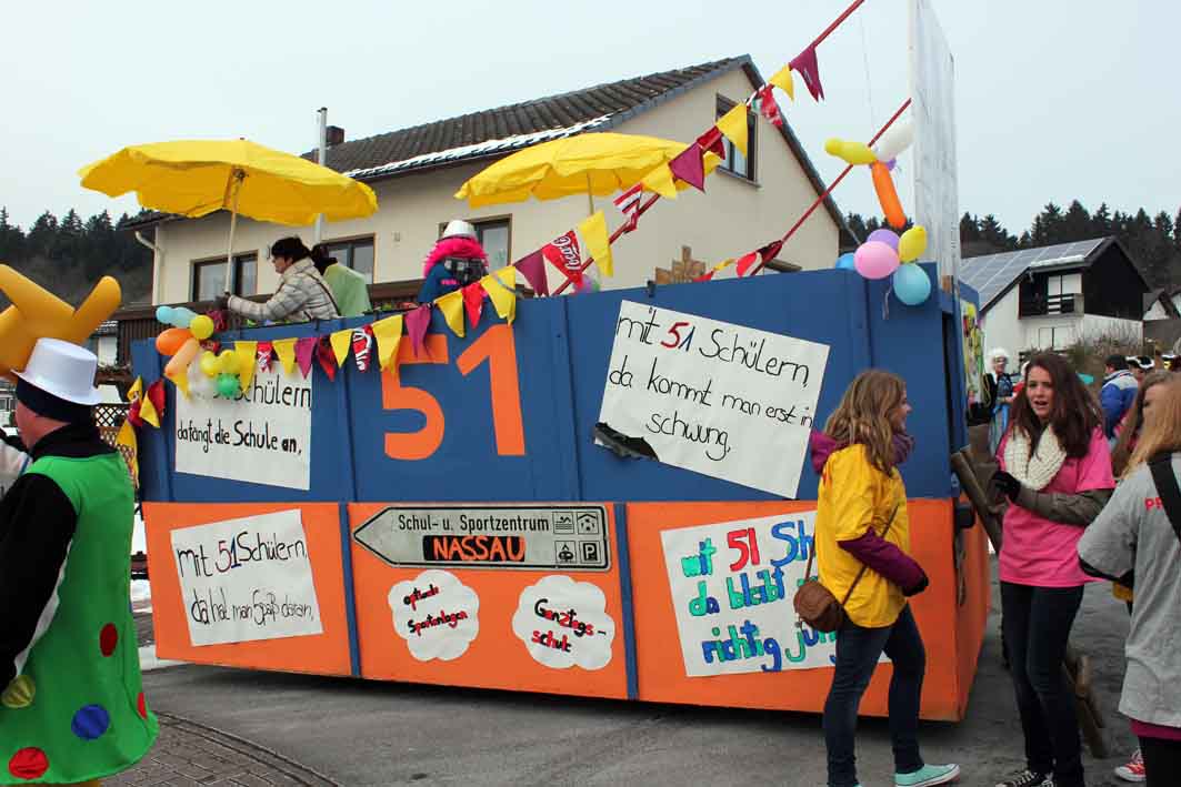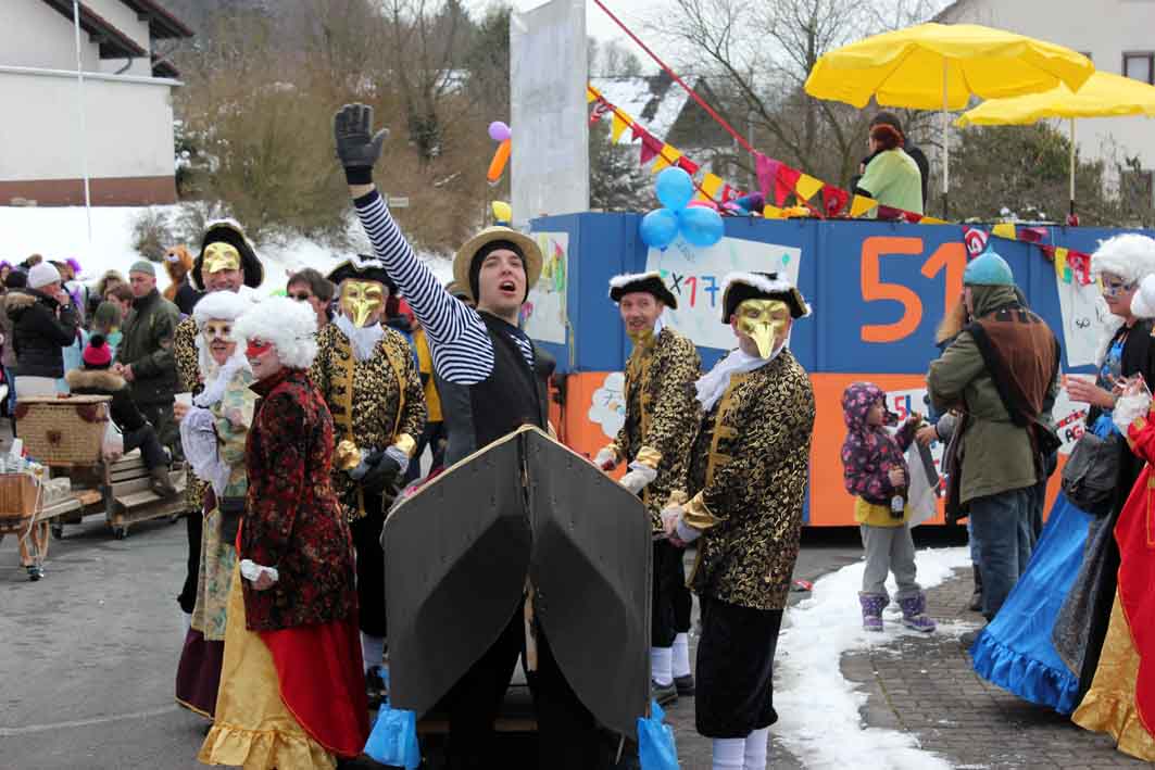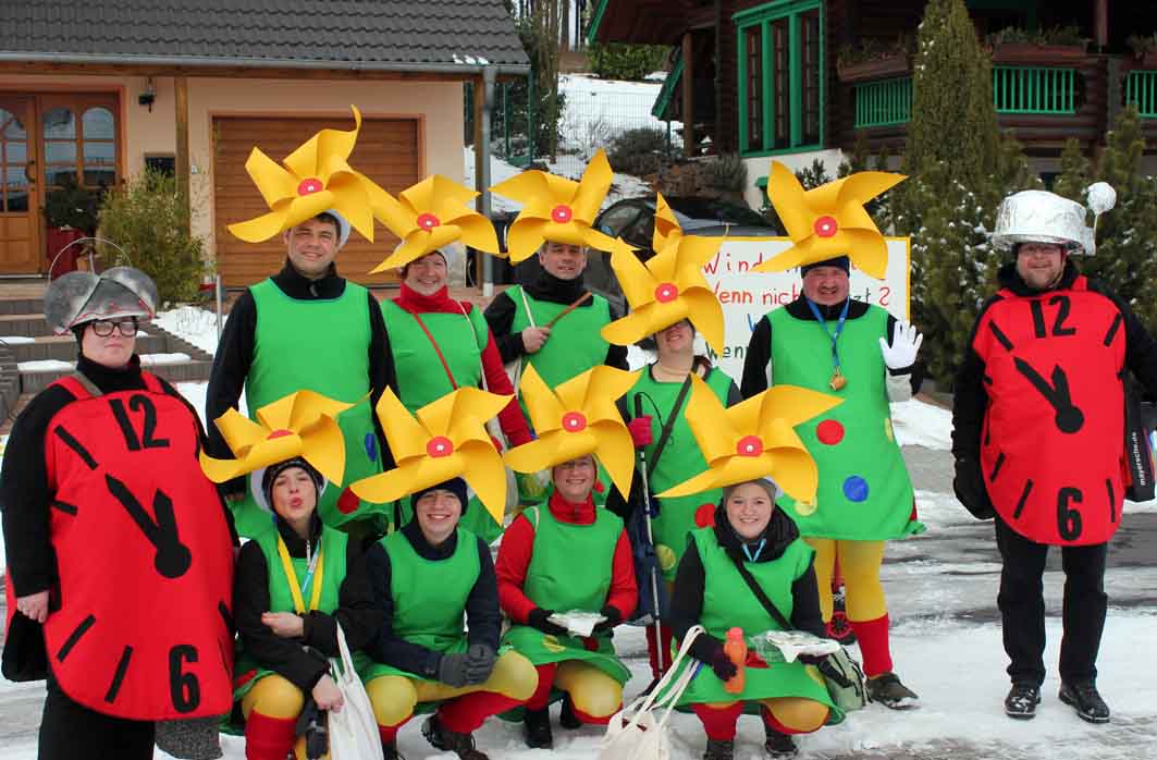 Zwei Motivwagen und sechs Fussgruppen mit 130 Aktiven bildeten den närrischen Lindwurm, der sich an Rosenmontag ungefähr eine Stunde durch Winden schlängelte. Hippies aus Sulzbach und der Motivwagen der Nassauer Schule sowie Windkrafträder aus dem Hunsrück machten in Winden Station. Selbst eine venezianische Gondeltruppe hatte den Weg von Italien in die Höhengemeinde nicht gescheut. Drei Bienenköniginnen klärten über das Leben der Bienen auf, Weihnachtsbäume tummelten sich im Straßenkarneval. Allen voran schritt der Elferrat, und die Gymnastikfrauen feierten mit Andrea Berg. Auch das Rodeln mit anschließender Gaudi kam nicht zu kurz. Rundherum ein schöner Zug vor einem bestens gelaunten Publikum.