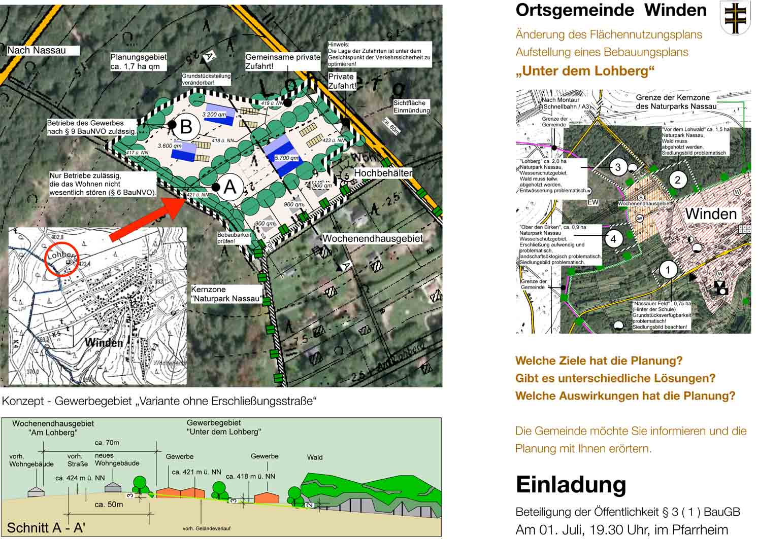 In einer Bürgerversammlung am Montag, 1. Juli, 19.30 Uhr, im Pfarrheim will die Ortsgemeinde die Windener Bürgerschaft an der Planung des Gewerbegebiets „Unter dem Lohberg“ beteiligen. Der vorliegende Entwurf eines Bebauungsplans wird jedem interessierten Bürger dargelegt und erläutert.