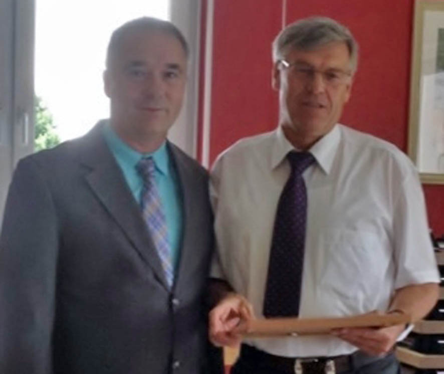 Ortschef Linscheid (li.) überreichte Heinz-Jürgen Schlösser die Dankesurkunden der Ortsgemeinde und des Städte- und Gemeindebundes.