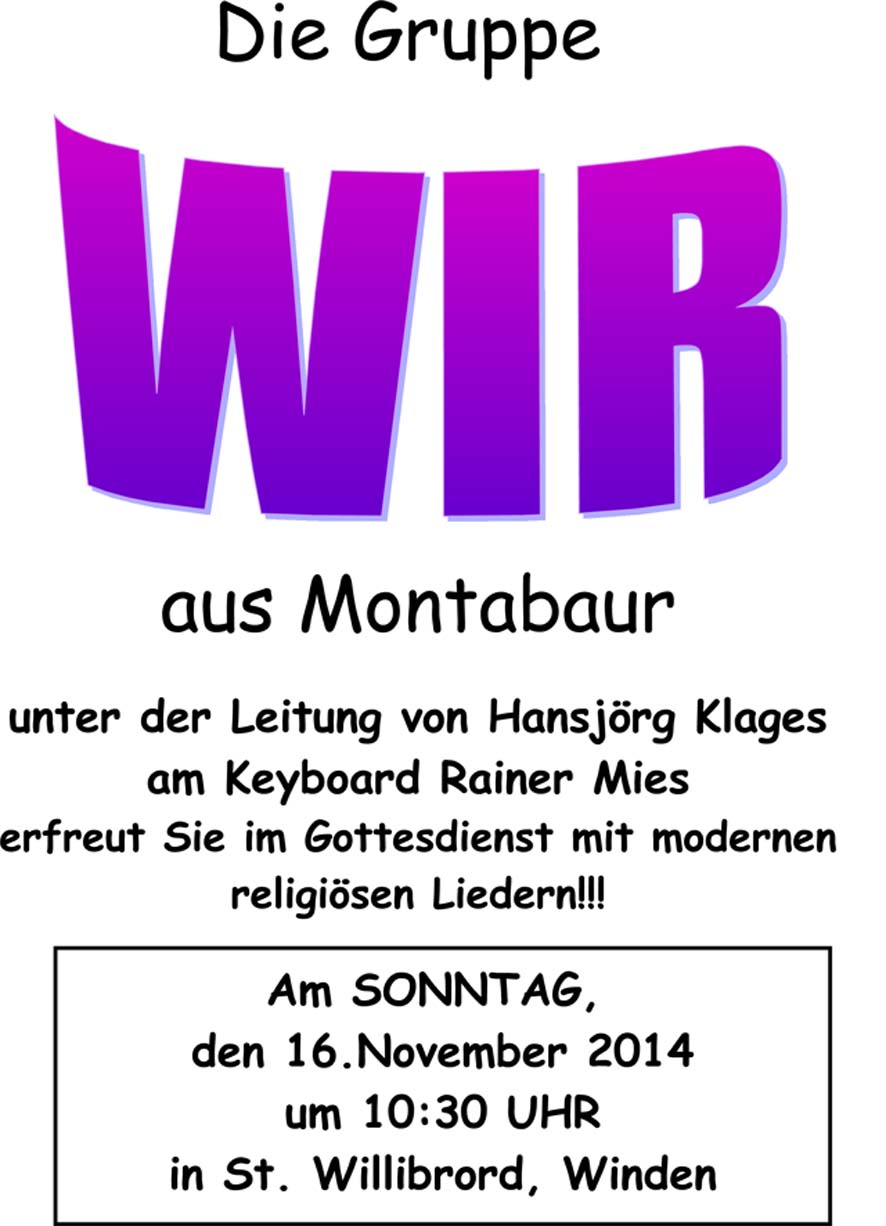 Die Gruppe WIR aus Montabaur tritt am Sonntag, 16. November, 10.30 Uhr, während des Gottesdienstes in der katholischen Kirche St. Willibrord Winden auf.