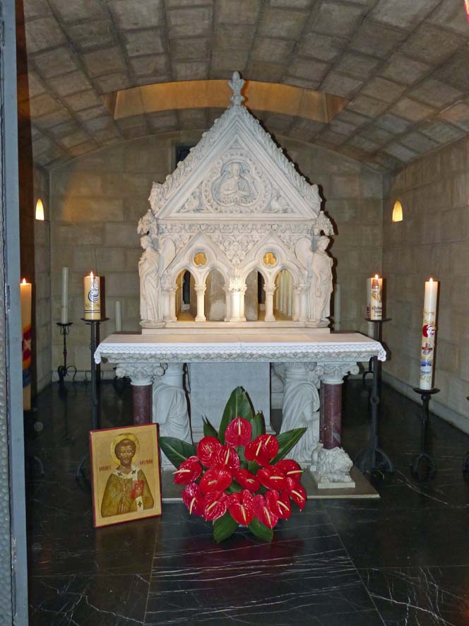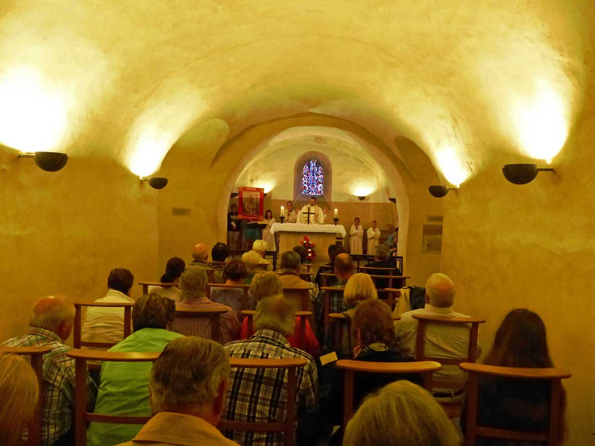 In Echternach angekommen, stärkten sich die Teilnehmer zunächst mit selbstgebackenem Kuchen, den die Damen des Ortsausschusses bereitgestellt hatten. Geschlossen ging es anschließend zur Basilika von Echternach, die von der Gruppe besichtigt werden konnte, bevor sie einen Gottesdienst in der Krypta am Grab des hl. Willibrord feierten. In seiner Predigt zeichnete Pater Egenolf noch einmal das Wirken des Windener Orts- und Kirchenpatrons nach, auch im Hinblick auf die augenblickliche Situation der katholischen Kirche. Er ermutigte die Teilnehmer, sich ihren christlichen Glauben auch in Zukunft zu bewahren und zu bezeugen. Nach dem Gottesdienst trafen sich alle Wallfahrer zum Gruppenfoto vor dem Eingangsportal, um sich anschließend wieder auf den Weg Richtung Busparkplatz zu begeben. Das Mittagessen wurde im Gasthaus Ferring in Winden eingenommen.