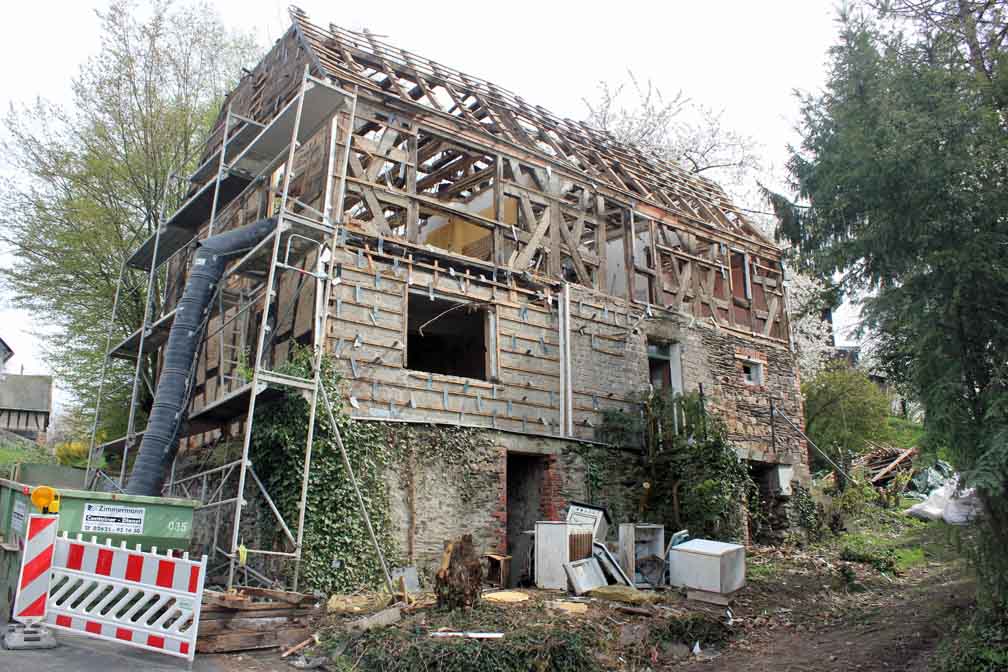Eines der ältesten und zugleich größten Fachwerkhäuser in der Windener Obertalsstraße wird zurzeit abgerissen. Jahrzehnte lang verbarg sich die wahre Substanz dieses altehrwürdigen Gebäudes unter einer hässlichen Fassade. Nun zeigt sich ein letztes Mal die alte Schönheit. Im Inneren des Gebäudes offenbaren sich dem Auge des Betrachters zum Teil original Stuckdecken. Schade, meinen manche Windener, die sich an schlechter erhaltene Fachwerkhäuser erinnern können.