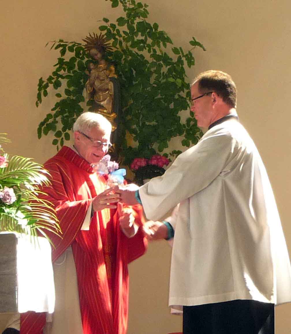 Gerald Eschenauer bedankte sich bei Pater Harr für dessen unermüdliche Tätigkeit innerhalb der Pfarrei, insbesondere im Kirchort St. Willibrord Winden, und überreichte ihm ein kleines Präsent. Pater Harr zeigte sich erfreut und gerührt über diese für ihn unerwarteten Überraschung. Nach dem Gottesdienst hatten Mitglieder des Ortsausschusses einen kleinen Sektempfang organisiert, bei dem die zahlreichen Besucher Gelegenheit hatten dem Jubilar persönlich zu gratulieren.