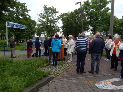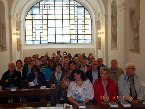 Nach dem Gottesdienst trafen sich die Wallfahrer zum Gruppenfoto auf dem Vorplatz des Fuldarer Doms, um im Anschluss die unmittelbar am Dom gelegene Michaelskirche zu besichtigen. Diese wurde im vorromanischen, karolingischen Baustil im Auftrag von Abt Egil in den Jahren 820 bis 822 erbaut. Sie gilt als der älteste Nachbau der Grabeskirche in Deutschland und zählt zu den bedeutendsten mittelalterlichen Sakralbauten Deutschlands. Anschließend fuhren die Teilnehmer zum Mittagessen im Parkhotel Kolpinghaus Fulda. An dieser Stelle ein Lob an den Service und die Küche des Hotels für die überaus zügige und professionelle Bewirtung.