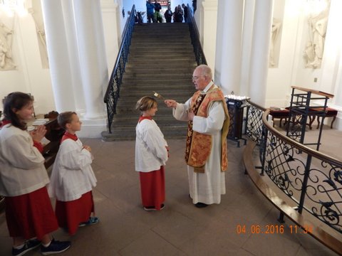 Auf dem Weg nach Fulda stimmte Pater Benno Schmitz die Wallfahrer mit besinnlichen Texten sowie gemeinsamen Gesang und Gebet auf den Besuch der Grablege ein. Während einer kurzen Pause auf einer Raststätte konnten sich die Teilnehmer an einem vom Ortsausschuss bereitgestellten Frühstück stärken. In Fulda angekommen, ging es geschlossen zum Dom, der kurz besichtigt werden konnte, bevor die heilige Messe am Grab des Heiligen Bonifatius gefeiert wurde. Pater Benno Schmitz zeichnete in seiner Predigt das Wirken des Heiligen nach, auch im Hinblick auf die augenblickliche Flüchtlingskrise sowie der gesellschaftliche Lage innerhalb Deutschlands. Er ermutigte die Teilnehmer, sich ihren christlichen Glauben zu bewahren und sich auch durch Zweifel und Anfeindungen nicht beirren zu lassen, so wie es Bonifatius vorgelebt habe. Zum Schluss der Messe erhielt jeder Teilnehmer von Pater Schmitz seinen persönlichen Segen mit der Segnungsreliqie des Hl. Bonifatius.