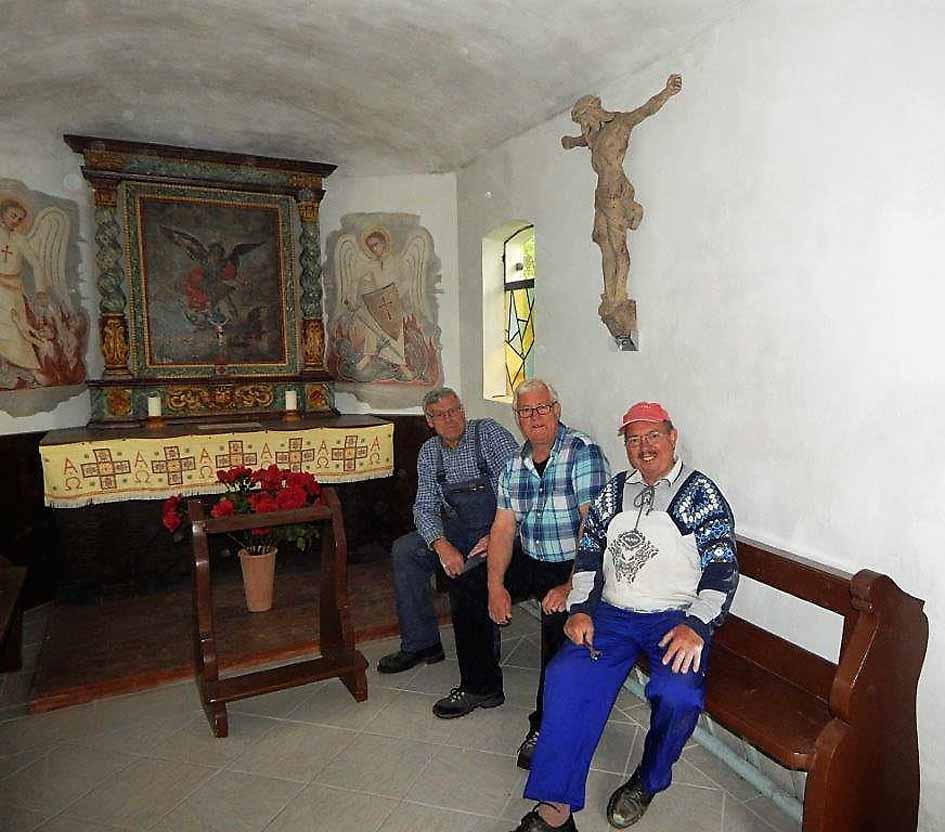 Hierfür bot sich die Michaelskapelle an. Nachdem Günter Wolf die vorbereitenden Arbeiten zur Befestigung der Figur durchgeführt hatte, konnte diese von Gerald Eschenauer, Jürgen Müller, Günter Wolf und Heinz-Jürgen Schlösser an der Seitenwand der Kapelle für jedermann einsehbar aufgehängt werden.