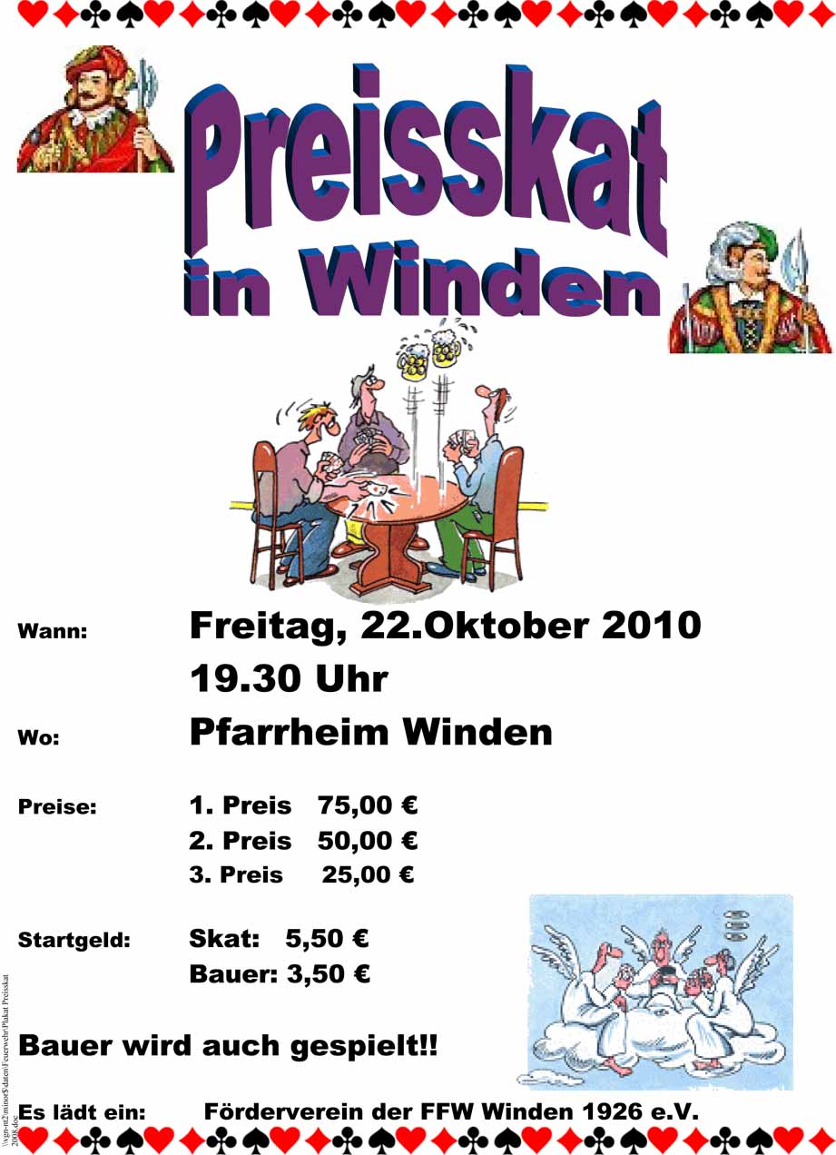 Der Förderverein der Freiwilligen Feuerwehr Winden 1926 lädt ein zum Preisskat am Freitag, 22. Oktober, um 19.30 Uhr im Pfarrheim Winden. Den Siegern winken attraktive Preise: Als erster Preis sind 75 Euro ausgelobt, als zweiter Preis 50 und als dritter Preis 25 Euro. Das Startgeld beträgt 5,50 Euro. Gespielt wird außerdem „Bauer“; das Startgeld hierfür beträgt 3,50 Euro.